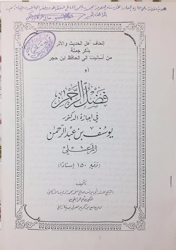 6. إتحاف أهل الحديث والأثر بذكر جملة من أسانيدنا إلى الحافظ ابن حجر أو فضل الرحمن في إجازة الدكتور يوسف بن عبد الرحمن المرعشلي.