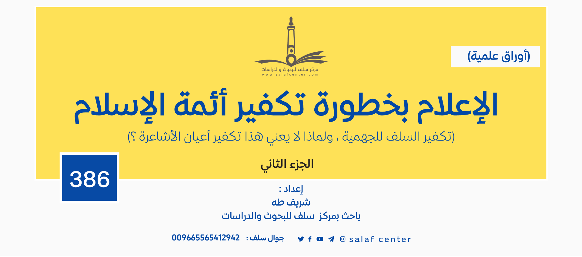 للتحميل كملف PDF اضغط على الأيقونة مقدمة: اختلف العلماء في الموقف من علم الكلام، فمنهم المادح الممارس، ومنهم الذامّ المحترس، ومنهم المتوسّط الذي يرى أن علم الكلام نوعان: نوع مذموم وآخر محمود، فما حقيقة علم الكلام؟ وما الذي يفصِل بين النوعين؟ وهل يمكن أن يكون هناك علم كلام سلفيّ؟ وللجواب عن هذه الأسئلة وغيرها رأى […]