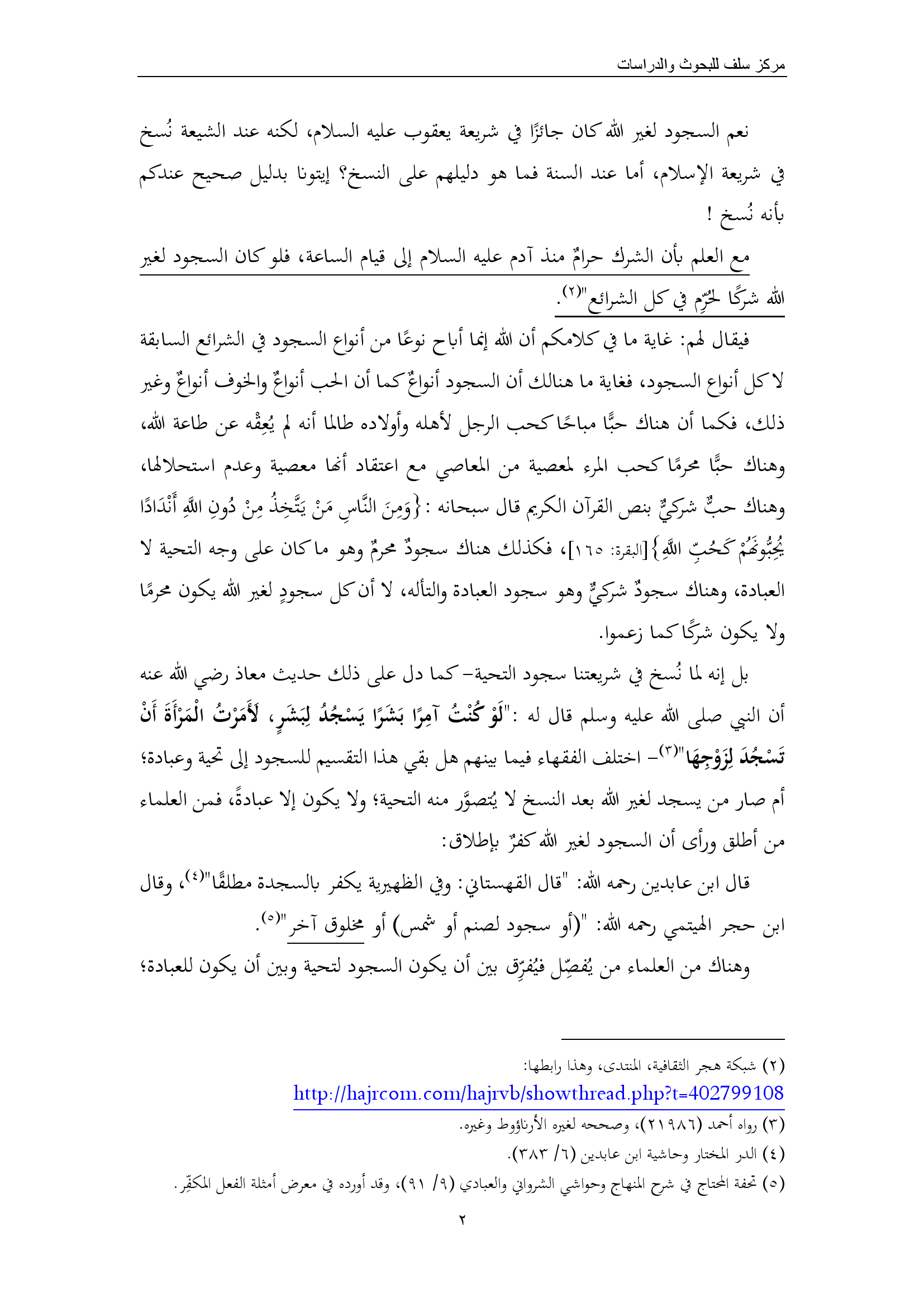 للتحميل كملف PDF اضغط على الأيقونة خامسًا: الاستدلال بإباحة التوسل وشدّ الرحل لقبور الصالحين: استدلّ المخالفون بما أجازه جمهور المتأخرين من التوسّل بالصالحين، أو إباحة تحرّي دعاء الله عند قبور الصالحين، ونحو ذلك، وهاتان المسألتان لا يعتبرهما السلفيون من الشّرك، وإنما يختارون أنها من البدع؛ لأنّ الداعي إنما يدعو الله تعالى متوسلًا بالصالح، أو عند […]