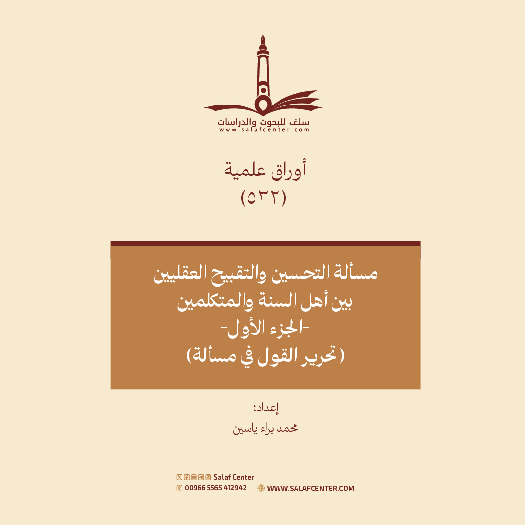 وحرصًا من مركز سلف للبحوث والدراسات على تجلية مسائل العقيدة وتمييز الحق من الباطل فيها جاء هذا البحث الذي هو بعنوان: (مسألة التحسين والتقبيح العقليين بين أهل السنة والمتكلمين) لمعالجة هذه المسألة بحسب الوسع والطاقة، وسعيت فيه لإيضاح حقيقتها وقول أهل السنة فيها، كما حرره شيخ الإسلام ابن تيمية وتلميذه ابن القيم، ثم تناولت أبرز أخطاء المعتزلة والأشاعرة فيها تحليلًا ونقدًا، مع ربط الخلاف بأصوله الكلامية، وبيان مآلات ولوازم الأقوال التي ذهب إليها كلٌّ من الطرفين.